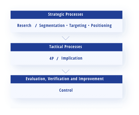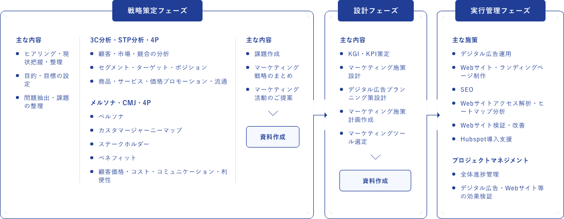 顧客の深い理解とニーズを核としたデジタルマーケティング戦略で、顧客体験を最大化します。3C(市場・顧客、競合、会社)分析、STP(セグメンテーション、ターゲティング、ポジショニング)分析、そして4P(製品、価格、プロモーション、プレイス)分析を組み合わせた総合的なアプローチで、マーケティング業務を全面的に支援します。マーケティングのデジタルトランスフォーメーション(DX)を推進し、顧客のニーズに応じた優れた体験を提供することで、売れる仕組みを構築します。